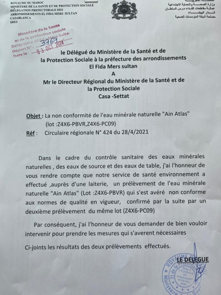 نفت وزارة الصحة والحماية الاجتماعية بشكل قاطع صحة الوثيقة المتداولة على مواقع التواصل الاجتماعي، والتي تحمل شعار مندوبية الوزارة في عمالة مقاطعات الفداء مرس السلطان، والمتعلقة بعدم مطابقة المياه المعدنية “عين أطلس” للمعايير الصحية.